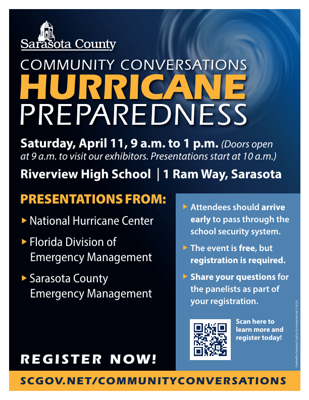 Sarasota County invites the community to attend the upcoming Community Conversations: Hurricane Preparedness event on Saturday, April 11, 2026, at Riverview High School.