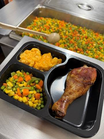 Photo: The meal for February 2, 2026. This consists of barbeque chicken legs, macaroni & cheese, and mixed vegetables